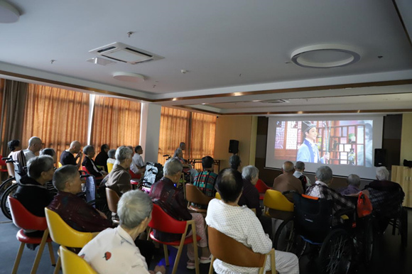 九月初九重陽(yáng)節(jié)上午,在位于江陰-靖江工業(yè)園區(qū)的博丞護(hù)理院,30多位老人在多功能廳濟(jì)濟(jì)一堂,興致勃勃地欣賞錫劇電影《珍珠塔》!昂每矗每!”96歲老人黃吉娣坐在第一排,她平時(shí)就喜歡聽(tīng)?wèi)蚯,這部電影正對(duì)她胃口。