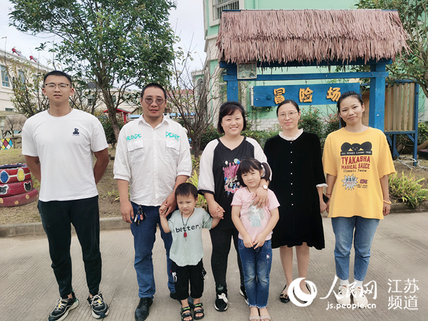 韓輝(左二)夫婦和一雙兒女與濱海幼兒園園長(zhǎng)、老師在一起。人民網(wǎng)記者 王繼亮攝