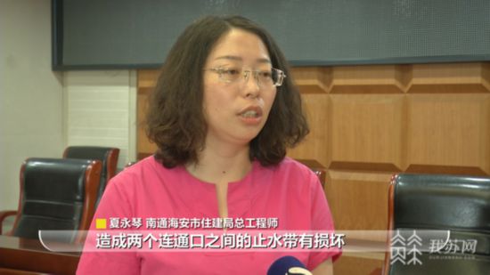 南通海安市住建局總工程師夏永琴說:“在不同埋深的地下室,兩個地下室之間的連通口,可能有不均勻沉降的情況,造成兩個連通口之間的止水帶有損壞!