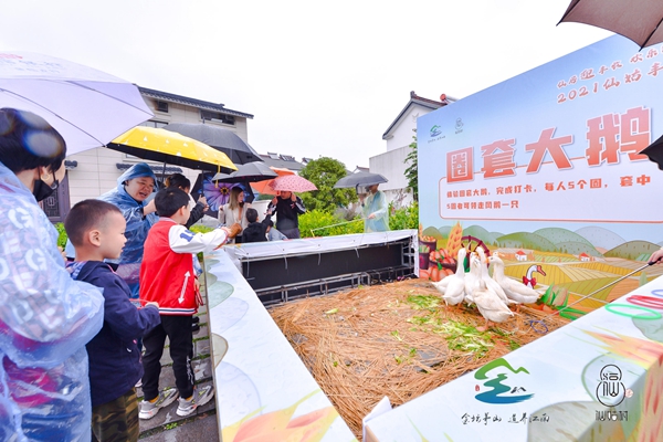 活動現(xiàn)場的“豐收園游會”更是熱鬧,獨(dú)輪車運(yùn)糧、扁擔(dān)挑起來、稻草人拾取、圈套大鵝……融合了農(nóng)事體驗(yàn)和農(nóng)耕文化與鄉(xiāng)村旅游的園游會活動受到了現(xiàn)場游客的熱捧!皫е⒆痈兄袼,體驗(yàn)農(nóng)事,接觸最美麗的大自然,走進(jìn)田野,來參與到當(dāng)?shù)剞r(nóng)民的生活中去,讓他們了解自然,了解農(nóng)耕文化,給城市里長大的孩子補(bǔ)上缺失的一課,我相信,這對孩子的成長一定會大有裨益!眮碜阅暇┑膹埾壬袊@道。