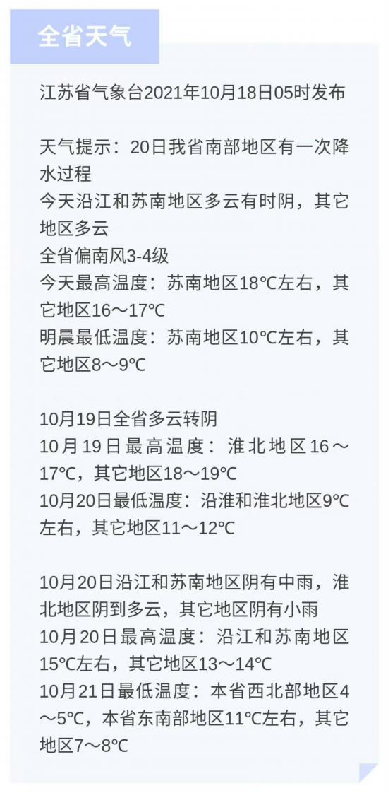 今天沿江和蘇南地區(qū)多云有時陰,其它地區(qū)多云,全省偏南風(fēng)3-4級,今天最高溫度:蘇南地區(qū)18℃左右,其它地區(qū)16~17℃,明晨最低溫度:蘇南地區(qū)10℃左右,其它地區(qū)8~9℃。