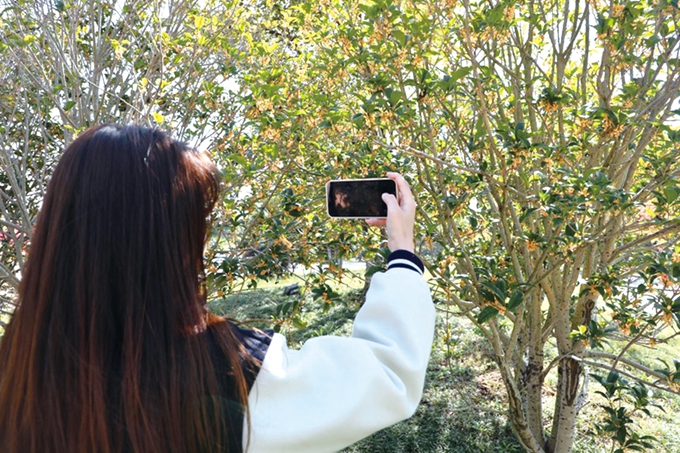 “一場秋雨一場涼,滿城盡是桂花香!卑殡S著瑟瑟秋風,我市的桂花悄然開放,小小的黃色花兒簇擁在一起,羞澀地躲在濃綠的葉子中間,如點點繁星,布滿枝頭,引得游人拍照留念。
