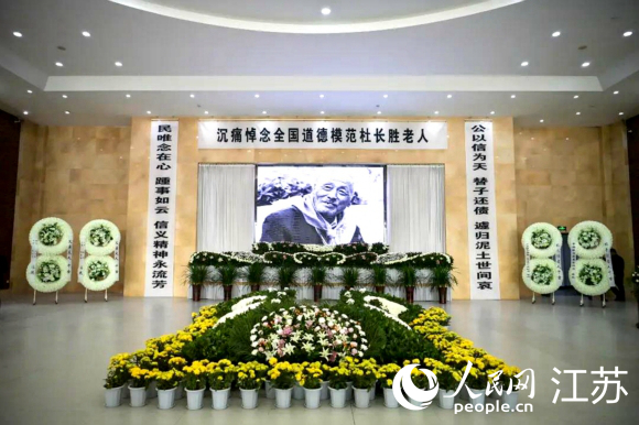 “公以信為天,替子還債,遽歸泥土世間哀;民唯念在心、踵事如云、信義精神永流芳!睔泝x館告別廳內(nèi)懸掛的這幅挽聯(lián),真實概括了杜長勝老人的誠信人生。老人2015年獲評“全國誠實守信道德模范”時的那張照片掛在中間,與以往不同,照片被調(diào)成了黑白色。