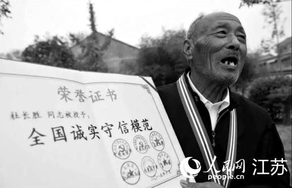 杜長勝老人生前展示其獲得“全國誠實守信模范”榮譽證書。睢寧縣委宣傳部供圖