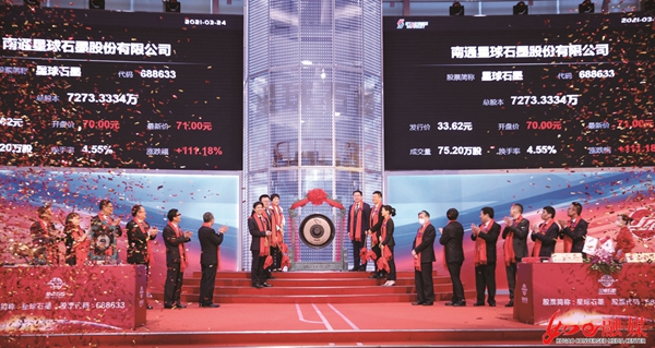 與此同時(shí),也有不少的企業(yè)將目光轉(zhuǎn)向了資本市場,希望通過直接融資來突破發(fā)展瓶頸。今年3月24日,南通星球石墨股份有限公司在上交所科創(chuàng)板正式掛牌上市,成為我市首家科創(chuàng)板上市企業(yè)。得益于多年的技術(shù)積累,星球石墨已經(jīng)成為國家制造業(yè)單項(xiàng)冠軍示范企業(yè)、國家首批“專精特新”小巨人企業(yè)。在當(dāng)前碳達(dá)峰、碳中和的背景下,擁有諸多優(yōu)異特性的石墨材料正迎來快速成長期。“研發(fā)是我們安身立命的根本,上市則是發(fā)展壯大的起點(diǎn)。接下來,星球石墨會(huì)按照更高的標(biāo)準(zhǔn)和要求來做企業(yè)、做產(chǎn)品,從石墨材料入手開拓高端市場!惫径麻L錢淑娟說。