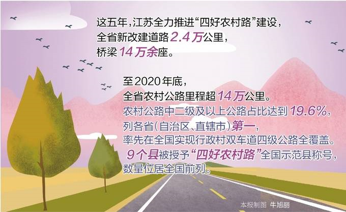 這5年,江蘇深入貫徹落實(shí)習(xí)近平總書記關(guān)于建設(shè)“四好農(nóng)村路”的重要指示批示精神,全力推進(jìn)“四好農(nóng)村路”建設(shè)。全省新改建道路2.4萬公里,橋梁14萬余座。至2020年底,全省農(nóng)村公路里程超14萬公里。農(nóng)村公路中二級及以上公路占比達(dá)到19.6%,列各。ㄗ灾螀^(qū)、直轄市)第一,率先在全國實(shí)現(xiàn)行政村雙車道四級公路全覆蓋。9個(gè)縣被授予“四好農(nóng)村路”全國示范縣稱號,數(shù)量位居全國前列。