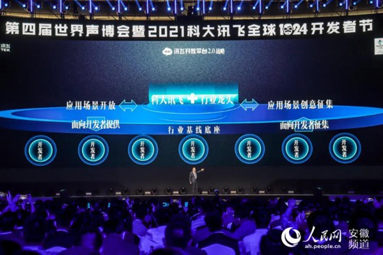 在第四屆世界聲博會暨2021科大訊飛全球1024開發(fā)者節(jié)上,訊飛開放平臺2.0正式發(fā)布。人民網(wǎng) 陳浩攝