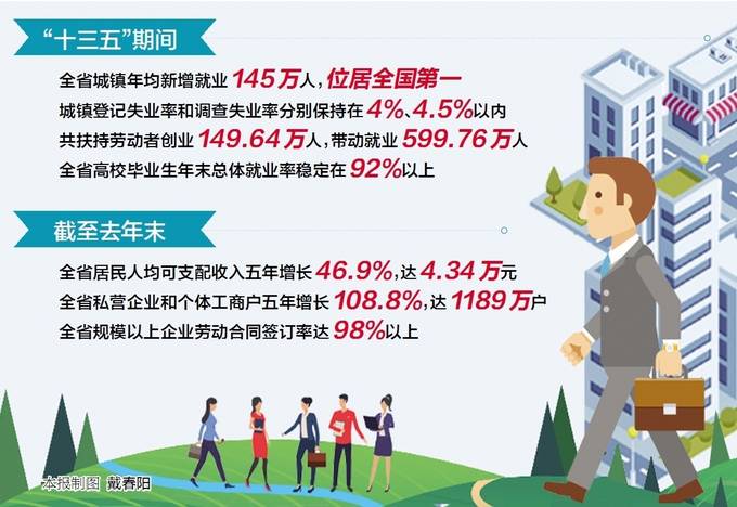 省人社廳副廳長張宏偉介紹,“十三五”期間,江蘇把穩(wěn)定和擴大就業(yè)作為經(jīng)濟運行合理區(qū)間的下限,將城鎮(zhèn)新增就業(yè)、調(diào)查失業(yè)率作為宏觀調(diào)控的重要指標,納入國民經(jīng)濟和社會發(fā)展規(guī)劃及年度計劃,全面落實就業(yè)優(yōu)先戰(zhàn)略,大力實施更加積極的就業(yè)政策。全省城鎮(zhèn)年均新增就業(yè)145萬人,位居全國第一;城鎮(zhèn)登記失業(yè)率和調(diào)查失業(yè)率分別保持在4%、4.5%以內(nèi),不僅較好解決了本地居民就業(yè),而且吸納了大量外來人口就業(yè)。