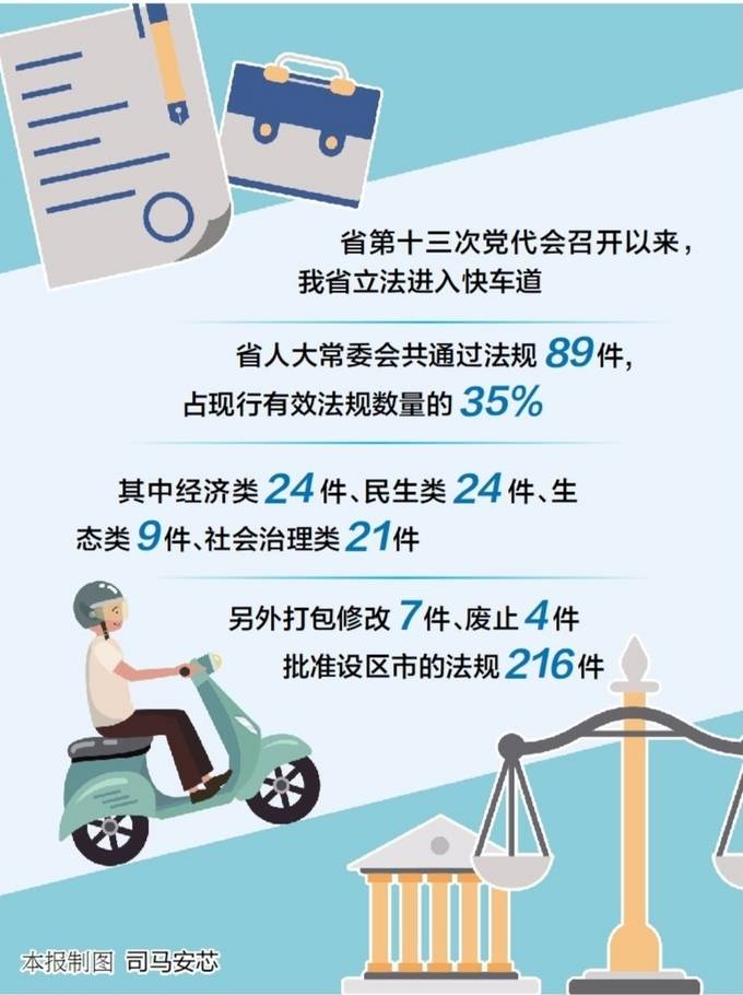 自1979年被賦予地方立法權(quán)以來(lái),至2021年9月29日,省人大常委會(huì)共通過(guò)法規(guī)677件,現(xiàn)行有效255件;批準(zhǔn)設(shè)區(qū)市的法規(guī)779件,現(xiàn)行有效415件。省第十三次黨代會(huì)以來(lái),我省立法進(jìn)入快車道,自2016年11月25日至2021年9月29日,近五年省人大常委會(huì)通過(guò)省級(jí)法規(guī)89件,占現(xiàn)行有效法規(guī)數(shù)量的35%,批準(zhǔn)設(shè)區(qū)市的法規(guī)216件。