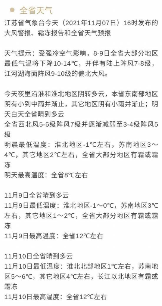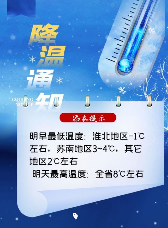 今天江蘇最高氣溫也就8℃!強冷空氣影響江蘇,今晨最低溫度:淮北地區(qū)-1℃左右,蘇南3~4℃,其它地區(qū)2℃左右,全省大部分地區(qū)有霜或霜凍,加上5-6級以上的西北風(fēng)呼嘯,風(fēng)寒效應(yīng)明顯,非常冷,體感妥妥的像冬天!晚上把大衣羽絨服找出來,家有老人小朋友的更需防寒保暖!