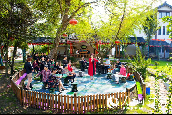 江蘇省無(wú)錫市桃源村民正在村小廣場(chǎng)自?shī)首詷?lè)。陶?qǐng)@攝