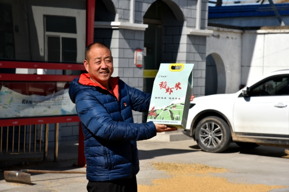 王強(qiáng)展示他們的優(yōu)質(zhì)水稻產(chǎn)品。徐守軍攝