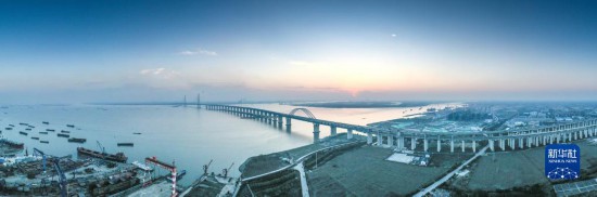 滬蘇通長江公鐵大橋沿岸日落景色(11月12日攝,無人機(jī)照片)。
