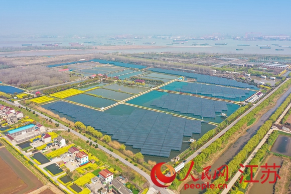 綠色能源島鎮(zhèn)江揚(yáng)中市鄉(xiāng)村濱江漁光互補(bǔ)電站。宋偉攝