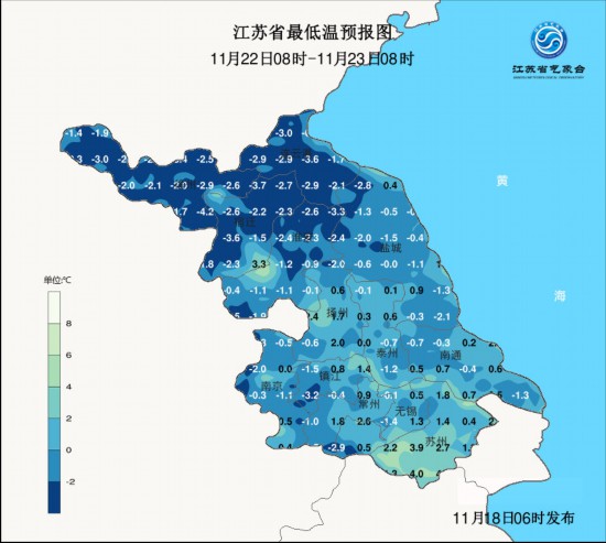 交匯點訊 11月18日晚,江蘇省氣象臺發(fā)布重要天氣報告:21日-23日江蘇將有大范圍寒潮天氣。