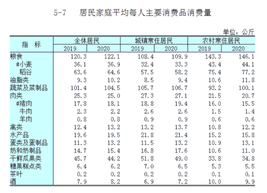 從居民家庭平均每人主要消費品消費量的統(tǒng)計來看,全體居民平均每人吃的蔬菜及菜制品為209斤,比2019年多吃了6.2斤;但肉類消費減少,平均每人吃掉50斤,比2019年少吃0.6斤。蛋類及蛋類制品消費比2019年上漲3.8斤,奶和奶制品則多消費掉1.4斤。