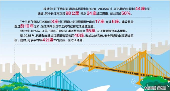 根據(jù)《長江干線過江通道布局規(guī)劃(2020-2035年)》,江蘇境內(nèi)共規(guī)劃44座過江通道,其中長江南京段98公里,規(guī)劃24座過江通道,占比超過50%。預計到2025年,江蘇已建和在建過江通道數(shù)量將達35座,過江通道瓶頸基本緩解。到2035年,已建和在建過江通道數(shù)量將超40座,形成功能完善、安全可靠的過江通道系統(tǒng)。南京過江通道建設在全省過江通道格局中占有舉足輕重的地位,屆時,平均4公里左右就有一座過江通道。