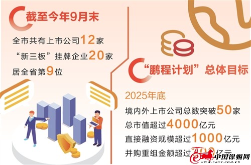 根據(jù)“鵬程計(jì)劃”提出的總體目標(biāo),到2025年底,全市上市公司規(guī)?偭砍掷m(xù)提升,境內(nèi)外上市公司總數(shù)突破50家,總市值超過4000億元(其中市值千億元以上1家,500億元—1000億元1家,100億元—500億元13家以上),縣域覆蓋面進(jìn)一步擴(kuò)大。上市公司支撐引領(lǐng)作用不斷強(qiáng)化,直接融資規(guī)模超過1000億元,并購重組金額超過300億元,重點(diǎn)產(chǎn)業(yè)鏈龍頭企業(yè)上市(掛牌)率超90%,著力培育一批總部型、龍頭型、國際化企業(yè),建設(shè)一批省級和國家級上市公司高質(zhì)量發(fā)展示范區(qū)。