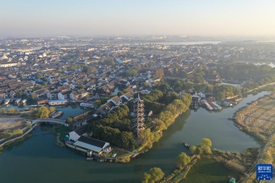 沐浴在晨曦中的周莊景色(11月24日攝,無人機(jī)照片)。