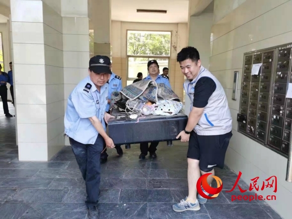 崇川區(qū)鐘秀街道網(wǎng)格員清理樓道雜物。黃欣攝