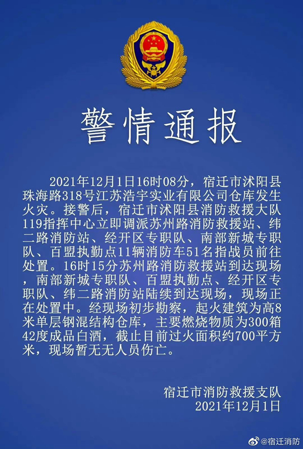 人民網(wǎng)南京12月1日電(黃啟源)據(jù)江蘇省宿遷市消防救援支隊通報,12月1日16時08分,宿遷市沭陽縣珠海路318號江蘇浩宇實業(yè)有限公司倉庫發(fā)生火災(zāi)。宿遷市消防救援支隊接警后,隨即調(diào)集11輛消防車、51名指戰(zhàn)員前往處置,目前火災(zāi)還在撲救中。經(jīng)現(xiàn)場初步勘察,起火建筑為高8米單層鋼混結(jié)構(gòu)倉庫,主要燃燒物質(zhì)為300箱42度成品白酒,截至目前,過火面積約700平方米,現(xiàn)場暫無人員傷亡。