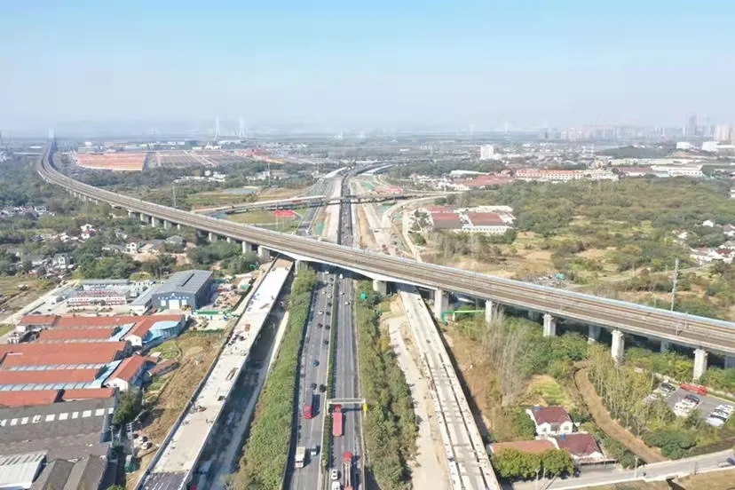 11月23日,“南沿江鐵路”上跨寧杭高鐵鋼橫梁架設(shè)完成。
