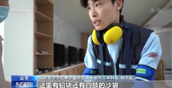 山東女子學院養(yǎng)老服務管理專業(yè)大二本科生 劉學昊:這里有鉛塊還有四肢的沙袋,是為了體會到老年人走路不容易,像這樣走路,走一段時間就會特別特別累,氣喘吁吁。