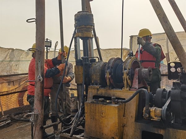圖為工人正在下管鉆探取樣,最深要下管江下土層100米。曈暚攝