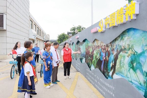 在靖江市城北園區(qū)北辰菜場附近,一面長約百米的黨史文化墻成為該路段的紅色風(fēng)景,墻面上圖文并茂描繪了中國共產(chǎn)黨成立以來的重要會議和中國革命的光輝歷程,每天都吸引了不少居民前去“打卡”。社區(qū)黨員方真如說:“經(jīng)常到這兒走一走、看一看,接受精神的洗禮,黨史文化墻讓我們更加堅定了聽黨話、跟黨走的決心。”