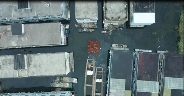 “水上蟹坊”水面都是油污和垃圾;淺水灣商業(yè)街店面從陽(yáng)澄湖取水排水,污水排放雨水口。圖片來(lái)源:江蘇省生態(tài)環(huán)境廳