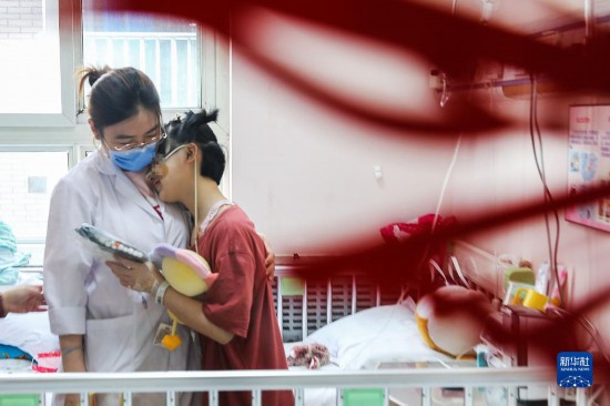 5月26日,一名患兒在北京兒童醫(yī)院腫瘤外科的病房內(nèi)擁抱醫(yī)護人員。