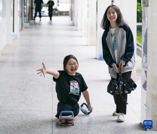5月10日,蔣張子怡(左)和同學在學校的走廊聊天。蔣張子怡是江西上饒中學高中一年級的學生。2010年一場車禍奪去了她的雙腿,如今的她只能依靠滑板代步,用雙手前行,為此,大伙都稱她“滑板姑娘”。她有著廣泛的興趣愛好,喜愛舞蹈、播音主持和寫作,希望可以成為一個多才多藝的人。