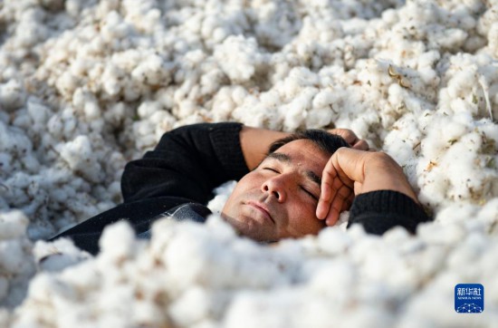 10月26日,在新疆沙雅縣托依堡勒迪鎮(zhèn)的一處棉田里,棉農(nóng)艾買爾·艾則孜躺在剛采下的棉堆里小睡。