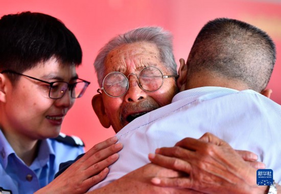 6月8日,公安部部署山東、四川、江蘇、河南四省公安機關(guān)同步開展“團圓”行動認(rèn)親活動,幫助11組失散家庭實現(xiàn)團圓。這是在“認(rèn)親,我們在行動”濟南主會場,90歲高齡的羅鳳坤(中)緊摟著被拐58年的兒子羅亞軍哭泣。