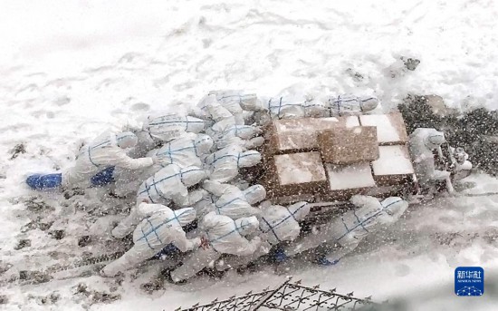 1月6日,在因新冠肺炎疫情被封閉的大連海洋大學(xué)校園內(nèi),志愿者推著滿載的三輪車上坡,將物資送往學(xué)生宿舍。