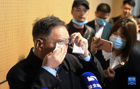 4月9日,張伯禮院士(左一)重訪武漢江夏方艙醫(yī)院,回憶疫情期間在此奮斗的經(jīng)歷時落淚。