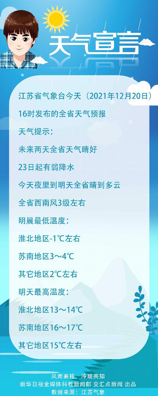 明天“冬至”,強(qiáng)冷空氣周末報(bào)到,24日夜間,江蘇可能迎來(lái)“初雪”。明天(12月21日)23時(shí)59分將迎來(lái)“冬至”節(jié)氣,“數(shù)九寒天”拉開(kāi)帷幕。根據(jù)江蘇省氣象臺(tái)對(duì)一周天氣的展望,本周23日夜里-24日全省有一次降水過(guò)程,需要關(guān)注24日夜里沿江和蘇南地區(qū)雨雪相態(tài)轉(zhuǎn)換,有可能轉(zhuǎn)小雨夾雪或小雪。
