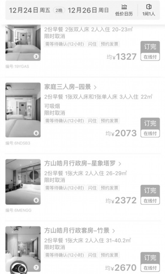 此外,連鎖酒店維也納酒店(南京江寧大學城店)12月20日價格穩(wěn)定在180元-275元不等,而12月24日-25日價格則在620元-1052元不等,價格翻了5倍,且大部分房間均已訂完。尚客優(yōu)精選(南京江寧區(qū)大學城店)由平時的100多元升至800多元。易佰旅店(交通學院地鐵站店)從134元漲到了719元。