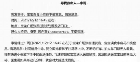 交匯點訊 日前,一條特殊的“尋人啟事”在宿遷不少人的社交平臺上刷了屏。記者了解到,這條尋人啟事尋找的是一個快遞小哥,他在偶遇兩歲寶寶窒息后,仗義出手,第一時間把孩子送往了最近的醫(yī)院后就悄悄離去。事后,孩子的父母為了向他當面表示感謝,便想到了網(wǎng)上尋人的方式。