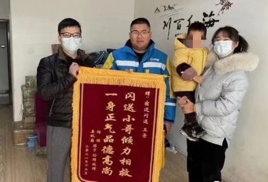 “當時送完孩子后,我就趕回去送貨了,好在沒耽誤救人,訂單也沒延誤!蓖蹙案嬖V記者,在經(jīng)理的幫助下,他和孫強取得了聯(lián)系,孫強還作為證人向交警部門證實了自己當時是因為救人才闖了紅燈,事情最終也得到了妥善解決。日前,孫強帶著妻子和寶寶又一起找到了孫強,向他贈送錦旗表示感謝。