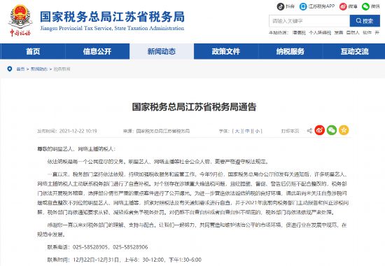 江蘇發(fā)布藝人主播等公眾人物涉稅問題自查通告 要求年底前糾正
