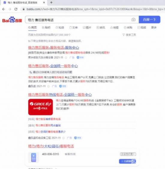 記者搜索關(guān)鍵詞"格力售后服務(wù)電話",排名靠前的結(jié)果都自稱"格力售后服務(wù)中心",有的電話號(hào)碼還是400開頭的服務(wù)電話,但當(dāng)記者咨詢對(duì)方是否是官方售后、能否對(duì)保修期內(nèi)的電器進(jìn)行免費(fèi)維修,對(duì)方都表示"不受理",聲稱自己負(fù)責(zé)保外維修的格力產(chǎn)品。