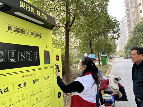 “陸阿姨,先掃掃這個(gè)顯示屏上的二維碼,然后根據(jù)語音提示操作就行了!弊嫱鐓^(qū)“守望”志愿者季燕華向居民介紹道。近日,居民發(fā)現(xiàn)小區(qū)垃圾分類回收亭旁多了幾個(gè)類似無人售貨機(jī)的機(jī)器——智能垃圾分類回收機(jī),可以回收廢紙、廢塑料、廢舊紡織品等舊物。
