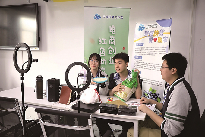 南京媒體職教行第一站來(lái)到南京商業(yè)學(xué)校。圖為該校學(xué)生通過(guò)直播助農(nóng),在線銷(xiāo)售漢中大米、白馬鎮(zhèn)藍(lán)莓。 本報(bào)記者 胡楠 攝