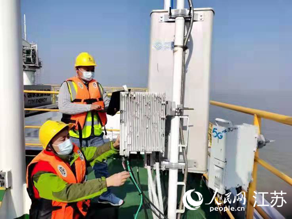 移動網(wǎng)絡建設人員在鹽城射陽龍源海上升壓站上調測5G網(wǎng)絡設備。江蘇移動供圖