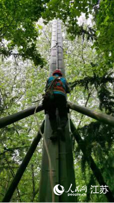 在常州洛陽鎮(zhèn),移動網(wǎng)絡建設人員爬上35米高的通信塔安裝5G設備。江蘇移動供圖