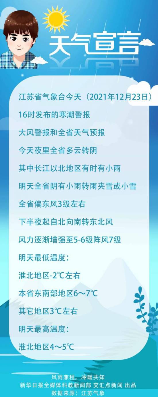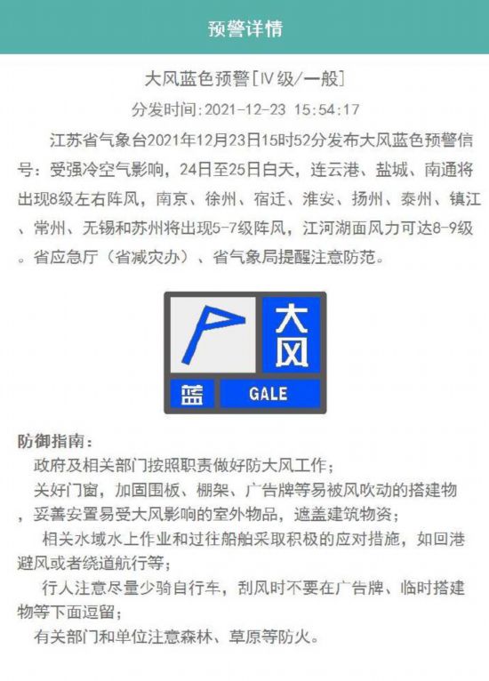 降溫來了,大風(fēng)也來了。江蘇省氣象臺2021年12月23日15時52分發(fā)布大風(fēng)藍(lán)色預(yù)警信號:受強冷空氣影響,24日至25日白天,連云港、鹽城、南通將出現(xiàn)8級左右陣風(fēng),南京、徐州、宿遷、淮安、揚州、泰州、鎮(zhèn)江、常州、無錫和蘇州將出現(xiàn)5-7級陣風(fēng),江河湖面風(fēng)力可達(dá)8到9級。