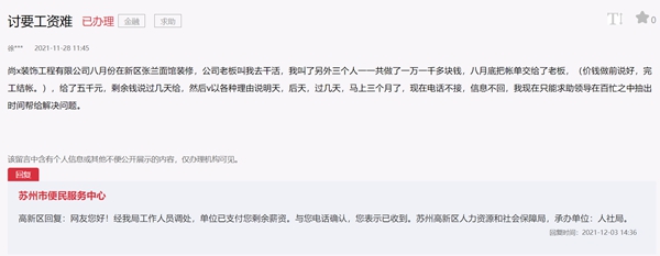 辦實(shí)事|留言后5天 蘇州高新區(qū)裝修工拿到被拖欠的工錢