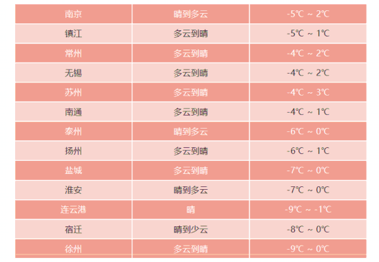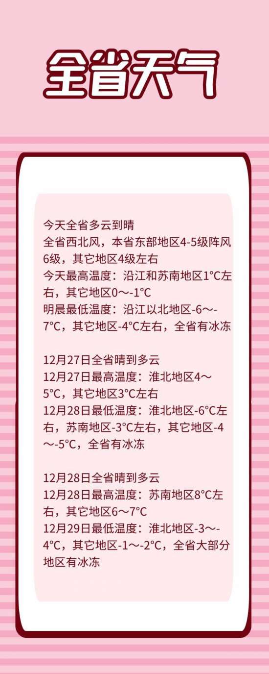 江蘇省氣象臺12月26日早上發(fā)布低溫報告和全省天氣預報。26-28日氣溫較低,全省有冰凍。今天(26日)全省多云到晴,全省西北風,本省東部地區(qū)4-5級陣風6級,其它地區(qū)4級左右,今天最高溫度:沿江和蘇南地區(qū)1℃左右,其它地區(qū)0~-1℃,明晨最低溫度:沿江以北地區(qū)-6~-7℃,其它地區(qū)-4℃左右,全省有冰凍。