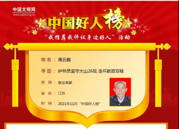 人民網(wǎng)徐州12月27日電 (閆峰)中央文明辦日前發(fā)布2021年11月“中國(guó)好人榜”,江蘇睢寧縣岠山林場(chǎng)護(hù)林員周云鵬上榜,以“護(hù)林員堅(jiān)守大山26載 走壞數(shù)百雙鞋”當(dāng)選為敬業(yè)奉獻(xiàn)“中國(guó)好人”。